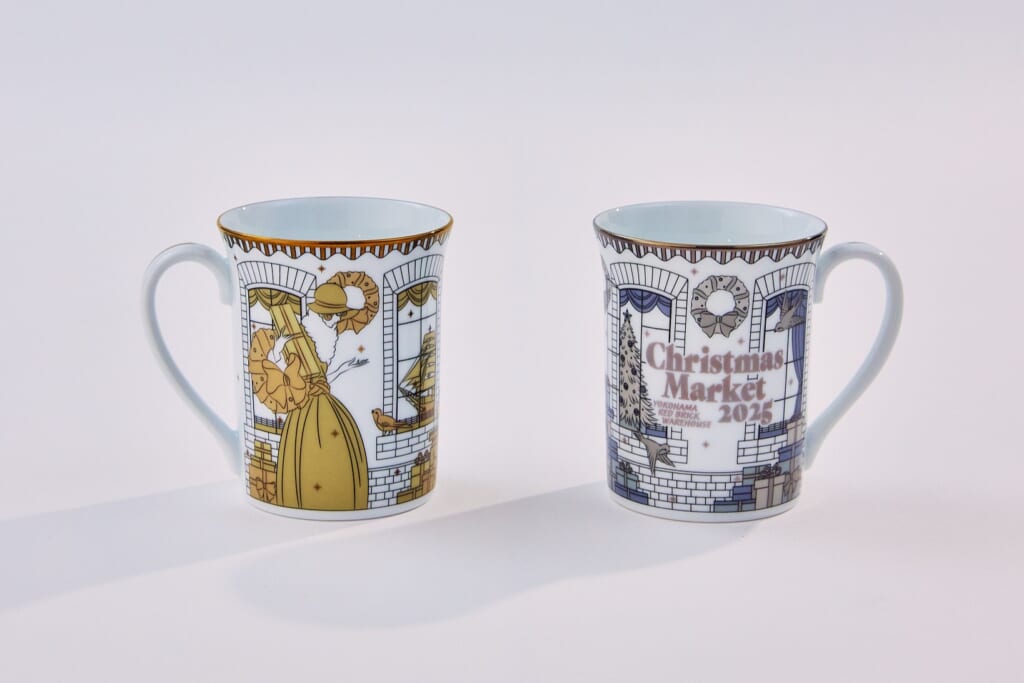 世界的洋食器ブランド「ノリタケ」と横浜赤レンガ倉庫がコラボレーションした特別なマグカップ。今回は、巨大なクリスマスツリーや沢山のプレゼントに囲まれ、淑女が穏やかに微笑む情景を表現。窓の外には横浜港に浮かぶ船が描かれています。艶やかな白磁の素地に金と銀のカラーが調和した、横浜赤レンガ倉庫のオリジナルデザインをお楽しみください。